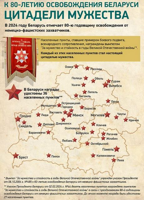 В 2024 году Беларусь отмечает 80-ю годовщину освобождения от немецко-фашистских захватчиков. Населенные пункты, ставшие примером боевого подвига, всенародного сопротивления, награждены вымпелом “За мужество и стойкость в годы Великой Отечественной войны”. Каждый из этих населенных пунктов стал настоящей цитаделью мужества.В Беларуси награды удостоены 36 населенных пунктов: