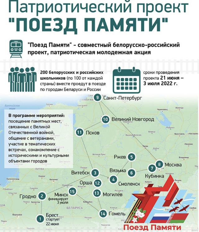 В 2022 году участниками патриотического проекта «Поезд Памяти» стали 200 белорусских и российских школьников, по 100 от каждой страны, которые за 15 дней посетили несколько городов двух стран. Школьники ознакомились с основными вехами Великой Отечественной войны, к которым был привязан маршрут движения поезда, состоялись встречи детей с ветеранами, посещение музеев, реконструкции военных событий, просветительные и культурные мероприятия