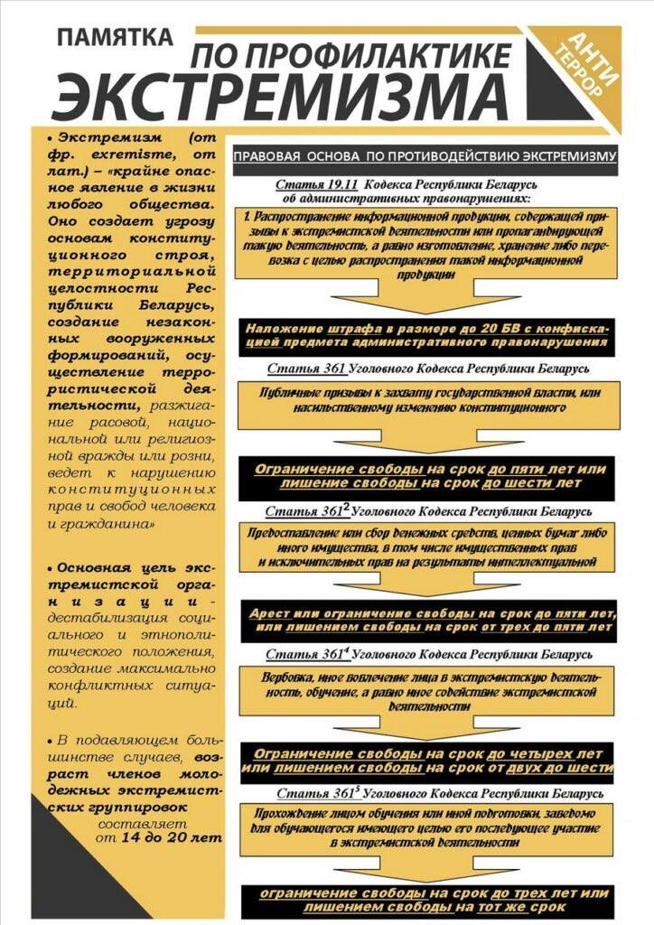 Экстремизм (от фр. exremisme, от лат.) – «крайне опасное явление в жизни любого общества. Оно создает угрозу основам конституционного строя, территориальной целостности Республики Беларусь, создание незаконных вооруженных формирований, осуществление террористической деятельности, разжигание расовой, национальной или религиозной вражды или розни, ведет к нарушению конституционных прав и свобод человека и гражданина».